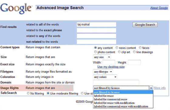 On May 27th 2009, Yahoo Image Search had introduced “Copyrights search” on images. But unfortunately, Yahoo had only access to the copyrights information of images hosted on flickr, their own company.